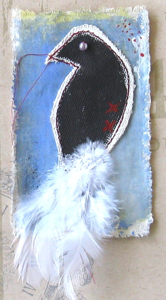 And while waiting for the dryer, I finished the piece below. it started with some treated muslin from Lynne Hoppe. I was intrigued by it and when it arrived, I loved it. I began by painting it and then left it alone because I had no idea what to do next. Today I drew a bird shape freehand on some canvas...one thing led to another and I stitched it onto the muslin background. Result: a black bird with white feathers.