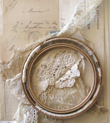 | Packet of French documents from Patina. Old Lace from various McKinney antique malls. Wooden hoops from Canton. |
