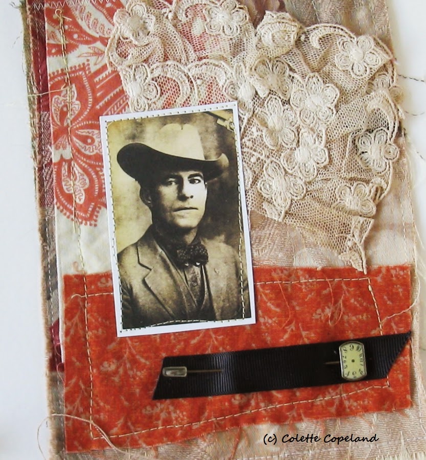 He's been in one of my folders for years. I've always thought of him as "Hombre" -- the first word (turned into a name) that came to mind when I saw the photo. He is the masculine foil to the feminine antique lace. So as not to completely overwhelm him, I added a [masculine] stick pin. Balance restored.